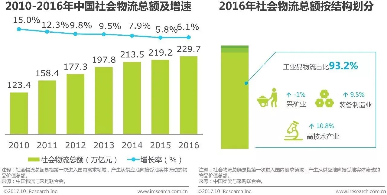 据国家统计局数据显示,2016年我国社会物流总额229.7万亿元,比上年增长6.1个百分点,增速小幅回升。其中工业品物流需求仍占主导地位,达到93.2%。具体到不同的工业品种类来看,采矿业、高耗能行业物流需求增速回落,采矿业物流需求由上年增长2.7%转为下降1%。装备制造业、高技术产业物流需求增速持续加快,分别比上年增长9.5%和10.8%,呈现出经济结构持续优化、新旧动能转换加快的特点。
