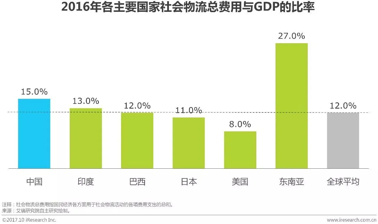 2016年,社会物流总费用为11.1万亿元,同比增长2.9%,继续保持低速增长。社会物流总费用与GDP的比率为14.9%,比上年下降1.1个百分点,经济运行中的物流成本有所下降,运行的质量有所提升。但与其他国家相比,仍存在一定差距。2016年我国物流费用与GDP的比率高出全球平均水平3%,高出美国6个百分点。与同样属于发展中的人口大国-印度相比,我国的比率同样处于较高水平。降本增效,提高物流运行质量是现阶段国内物流业发展的关键任务。