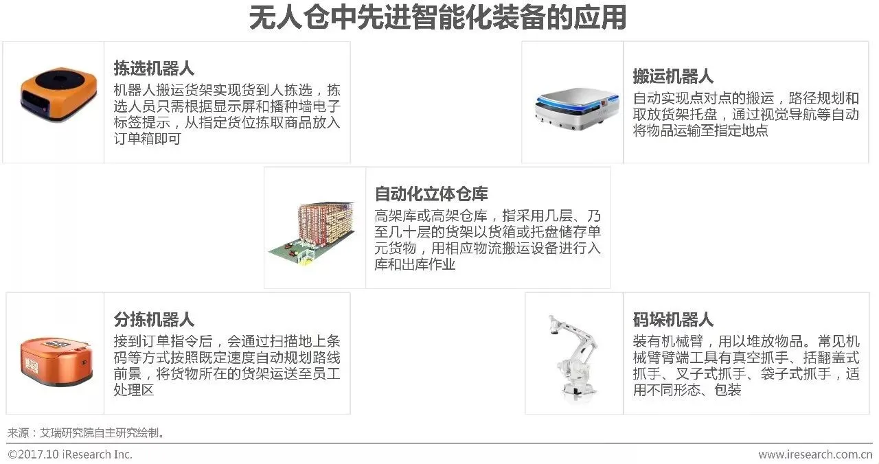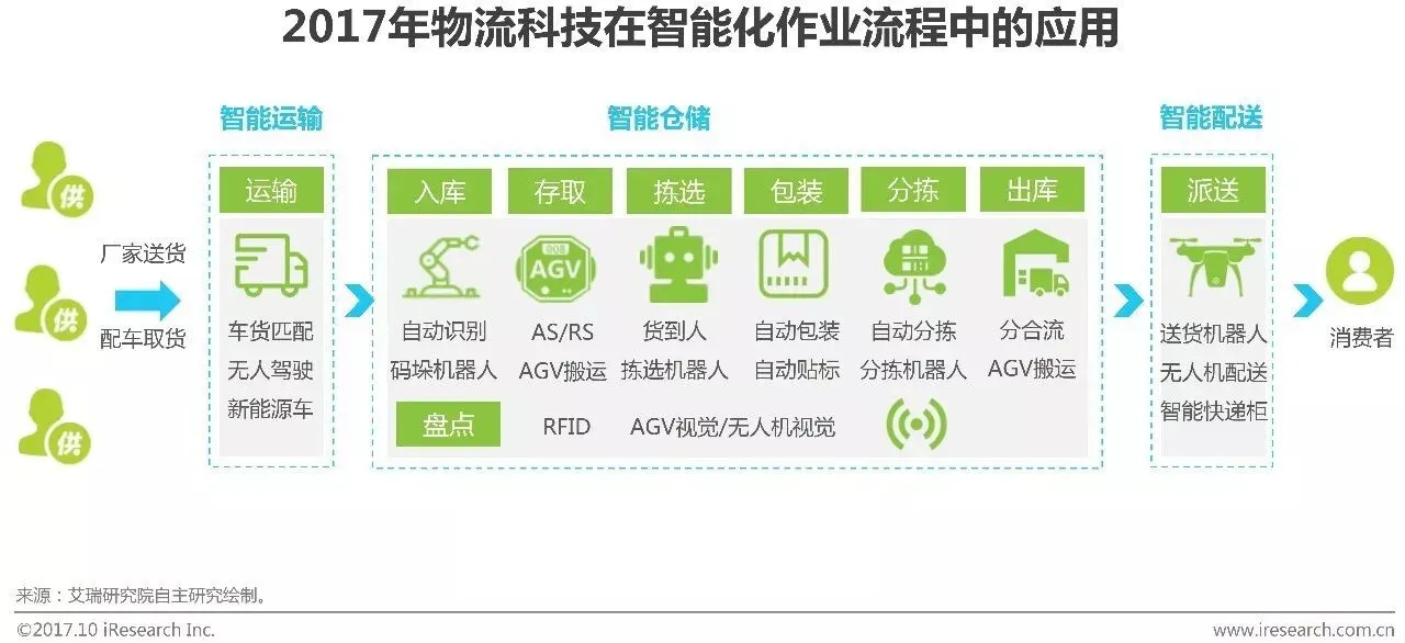 仓储行业正在变得更加自动化和智能化,自动化可以刚性提高效率,智能化可以满足差异化、个性化需求,增强供应链柔性。商品的入库、储存、拣选、分拣、出库等一系列流程,在无人仓中都可以用相应的自动化设备或者机器人替代。常见的有AGV机器人,根据不同用途又分为搬运、拣选和分拣等不同类型,以及专业从事码垛工作的码垛机器人。另外,RFID标签、立体仓库的应用等均显著减少成本费用,提高了作业效率。
