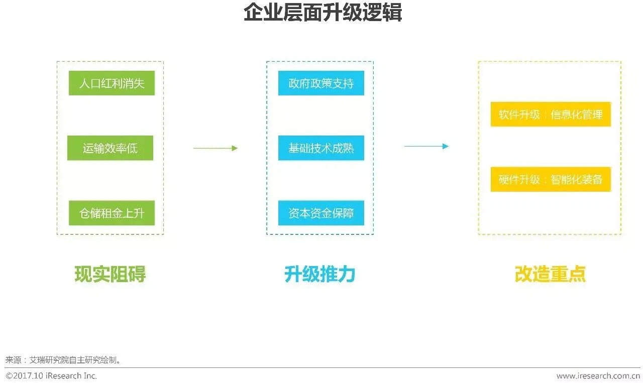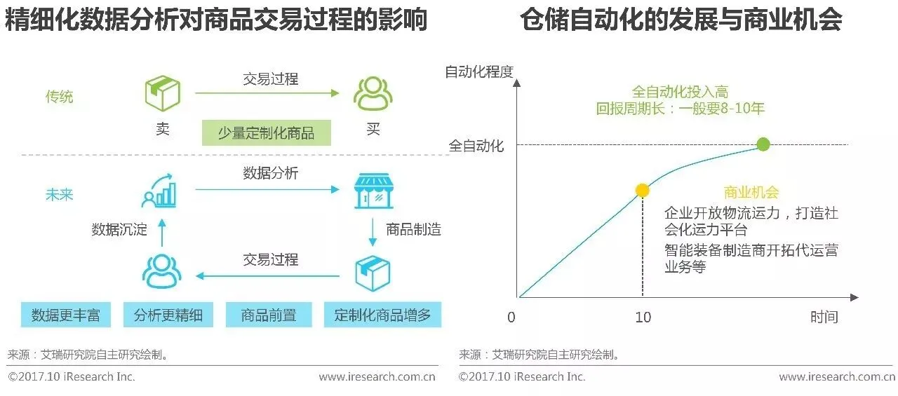 物流科技的创新将给传统的商业模式带来升级和变革。未来,大数据、云计算等技术的成熟和应用,可以更灵活的调整物流结构,由传统先订单后物流的模式,转变为分析消费数据,提前将一部分商品前置,或是生产符合客户需求的定制化产品,精准地配置库存,降低成本。另外,自动化设备方面,由于投资规模大,回报周期长,且改动成本高,一般要求对业务不要具有太多的变化,但目前国内商业发展活跃,变化快,因此10年内一般不会实行仓库全自动化,但自动化程度会逐渐提高,较好的兼顾供应链柔性。因此,一些大规模有实力的物流公司很有可能会凭借其自动化、智能化的供应链体系优势,打造社会化运力平台,惠及更多中小型企业。由于机器人价格昂贵,一些智能装备制造商也正开拓代运营业务,企业在成本允许范围内,能享受到更加先进的仓储管理服务。