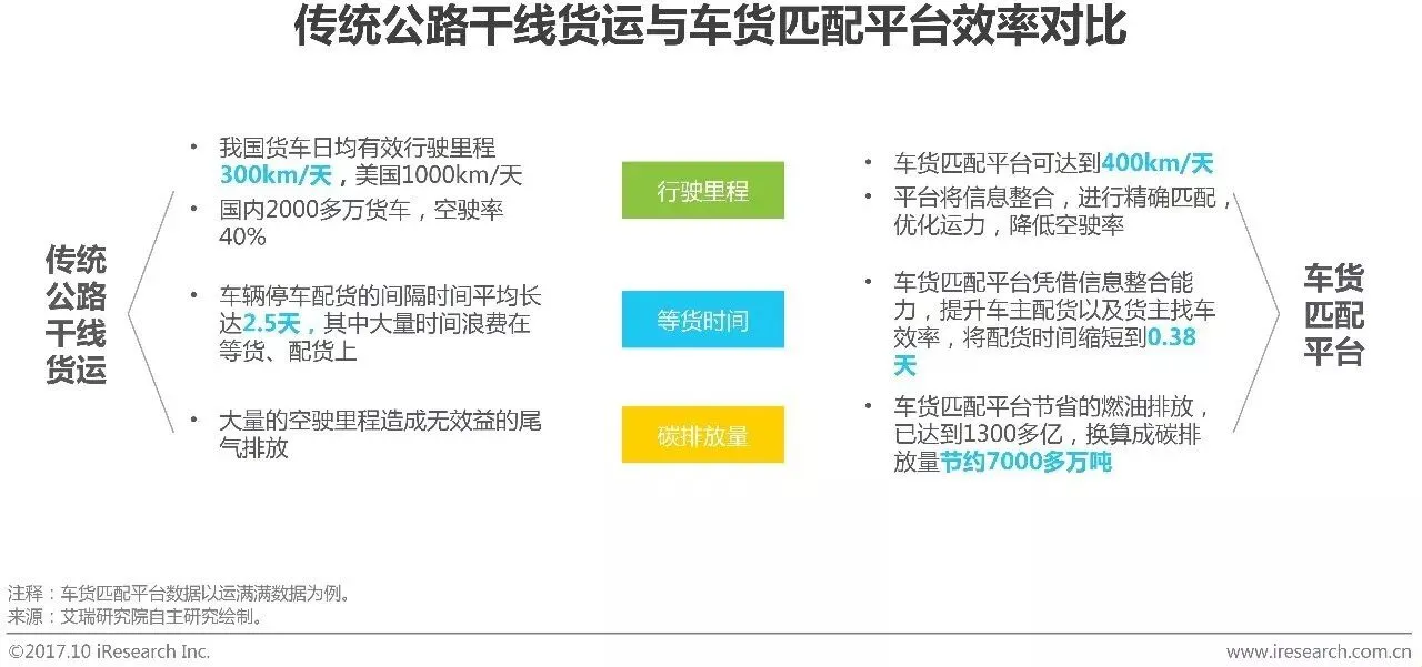 目前,我国的公路物流货运量占到了整体货运量的80%,干线物流在整个公路物流中占比最大,但是行业整体运作效率不高,我国货车日均有效行驶里程300km/天,美国则可以达到1000km/天。国内2000多万货车,空驶率40%。造成资源错配、效率低下的原因主要在于信息的不对称性,车货匹配平台利用信息技术将线下信息进行整合,发布信息并进行精准匹配,可以优化供应链下游的货物与司机的资源分配,降低空驶率,进而节约运输成本。