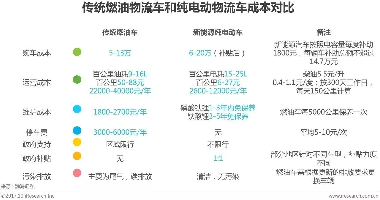 2017年最新出台的新能源车补贴政策,对新能源客车以动力电池为补贴核心,以电池的生产成本和技术进步水平为核算依据,并进一步完善新能源货车和专用车的补贴标准,按提供驱动动力的电池电量的分档累退方式核定。同时设定中央和地方补贴上限,其中地方(地方各级财政补贴总合)不得超过中央财政单车补贴额的50%。除燃料电池汽车外,各类车型2019-2020年中央及地方补贴标准和上限,在现行标准基础上回落20%。但对比传统燃油车,新能源纯电动车的运营和维护成本仍大幅降低,加上清洁,无污染,将在物流运输中大规模普及。