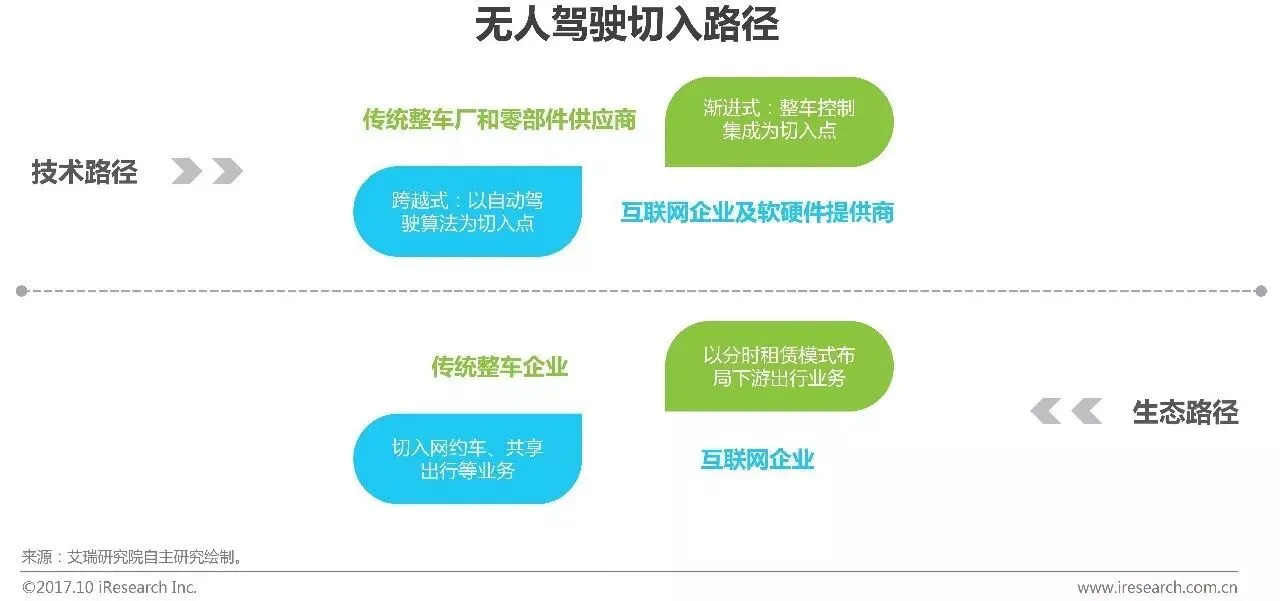 目前无人驾驶领域入局者主要有两方:一是谷歌、百度等互联网巨头以及英尔特等软硬件提供商,从自动驾驶算法切入,实现跨越式发展;二是奔驰、福田、一汽等传统老牌车企,以整车控制集成为切入点,借助高级辅助驾驶(ADAS)经验继续深入;双方的竞争从技术层面延伸至上下游的生态体系构建。目前共享出行理念的诞生和需求增加,分时租赁、网约车等形式也成为布局的重点。无人驾驶技术加上用户场景的建立,将会颠覆整个交通运输行业。