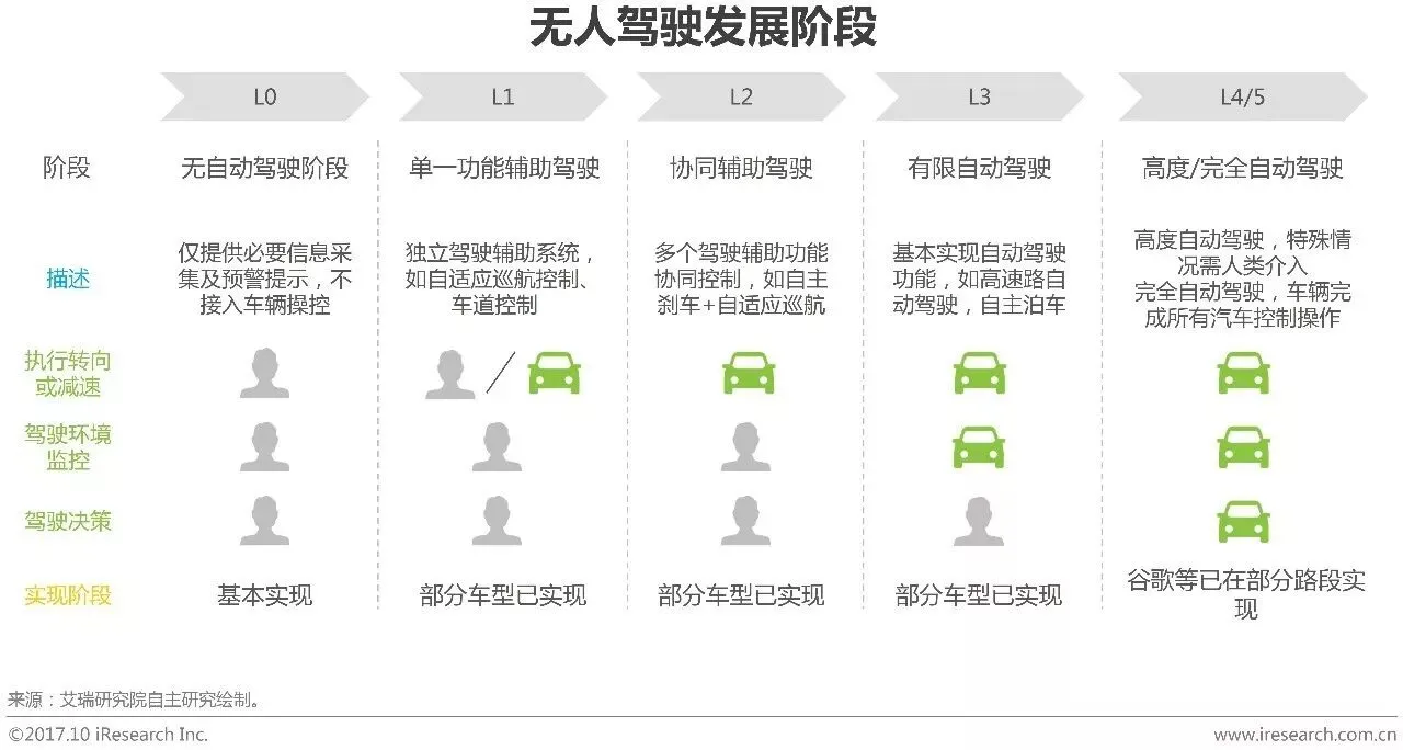 随着物联网、大数据、云计算等技术纷纷向汽车业渗透,汽车制造业迈向了智能化的时代,无人驾驶的实现备受期待。无人驾驶不仅可以为驾驶出行提供更多的安全保障,在商用的货物配送领域发挥空间更大。根据驾驶系统的自动化程度,无人驾驶从无自动驾驶阶段到完全自动驾驶共6个阶段。现阶段的发展应用还处于辅助驾驶向完全自动驾驶的过渡阶段,距离无人驾驶的大规模商用还有相当长的一段时间。