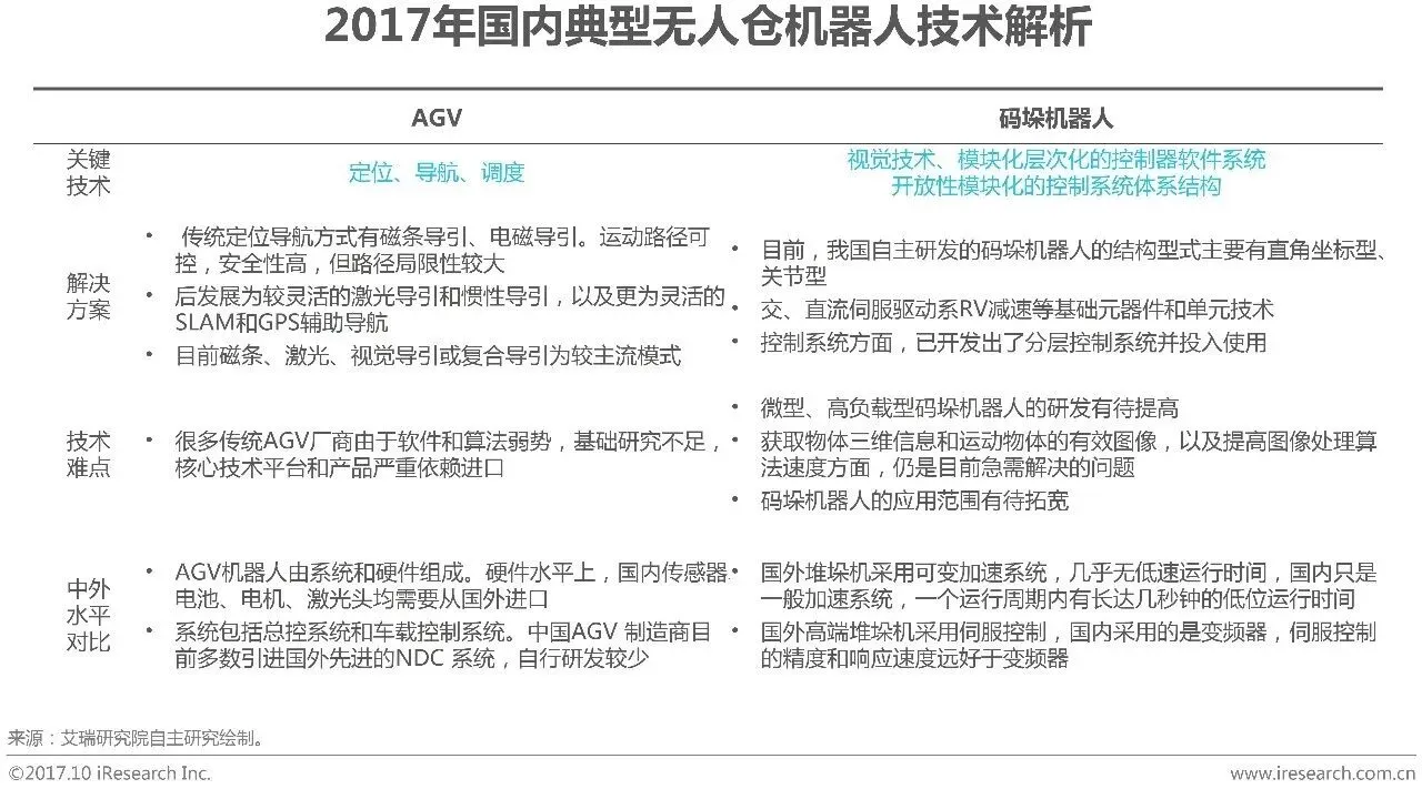 从单个AGV机器人来看,核心技术主要在定位、导航、避障等操作方面。但实际在无人仓中运作时,通常一个大型仓库需要配备几十甚至上百个机器人,如何通盘的调配和统筹安排,把集体效用发挥到最好才是考验技术实力的核心指标。针对码垛机器人,国内外的差距主要体现在控制系统上,国外一般采用的伺服控制,精度和响应速度远好于国内的变频器。