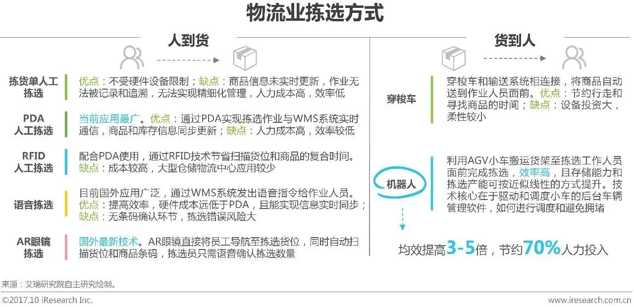 仓储物流的拣选一般有人到货和货到人两种方式。人到货方式中,当前应用最广的是PDA人工拣选,语音拣选、AR眼镜拣选等新兴技术尚未在国内普及。货到人方式中,主要有穿梭车和拣选机器人两种解决办法,都是根据拣货员指令,将所需的商品送到作业人员面前,节约行走和寻找时间。但前者设备投资大,柔性小。后者更加灵活,可根据实际需求,自主规划,相对于人工拣选,机器人操作均效提高3-5倍,节约人力70%。