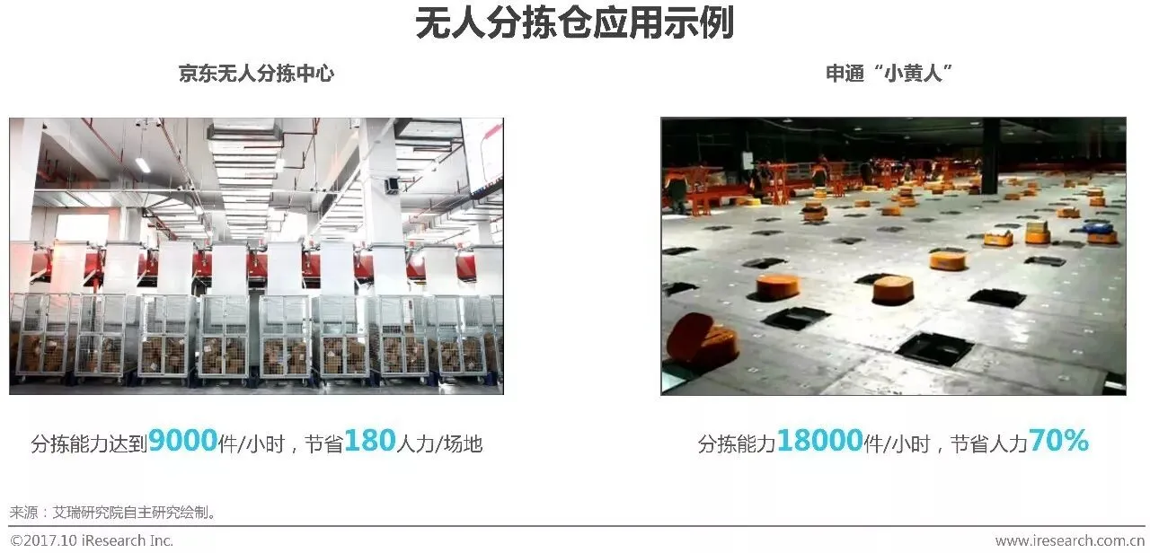 分拣环节的机器人应用能够节约70%左右的人力。2017年8月,京东物流昆山无人分拣中心正式亮相,昆山无人分拣中心最大的特点是从供包到装车,全流程无人操作。目前,该中心已经实现自动供包并对包裹进行六面扫描,保证面单信息被快速识别,由分拣系统获取使用,进而实现即时有效的分拣。申通的快递分拣机器人“小黄人”可以24小时不间断分拣,扫码、称重、分拣功能“三合一”,能够实现快递面单信息识别,以最优路线投递。