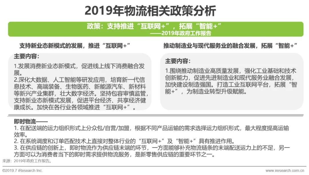 2019年3月,政府工作报告中特别提到物流行业的“互联网+”和“智能+”需要继续推进。而即时物流作为物流网络的一环,一方面运用不同的运力组织形式和调度匹配技术提高了运输效率,另一方面以其即时的特性促进了新零售供应链的建设,对“互联网+”和“智能+”的发展作出了贡献。