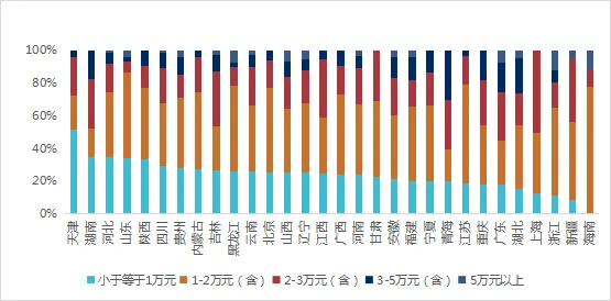 按照各省单车每月运费收入的分布情况可以看出,各省的单车运费收入主要集中在1万以内及1-2万两个区间,两个区间累计占比均在50%以上;其中,天津运费收入在1万以内区间的占比最高,达51.7%;其次为湖南,1万以内的收入占比34.8%;江苏、浙江、黑龙江、山东及北京运费收入在1-2万区间的比例整体较高,达到50%以上;2-3万收入分布较高的区域主要包括上海、新疆、江西、吉林、甘肃,占比在30%以上;收入3万以上的占比在各省份的占比都相对较低。