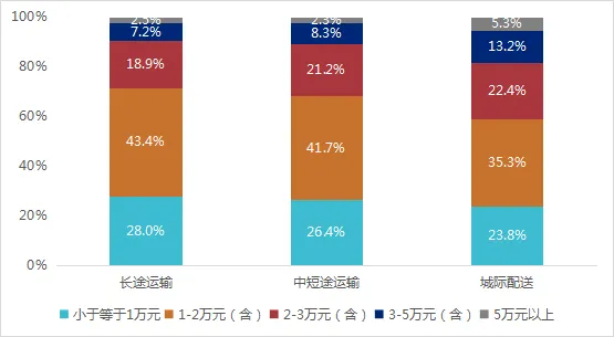 调研数据显示,在各运输距离收入分布中,城际配送整体收入水平最高,2万以上收入占比达40.9%;其次为中途运输,2万以上收入占比31.9%。长途运输整体收入水平偏低,2万以下收入占比71.4%。