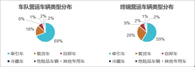 按照营运车辆在客户群体分布的情况来看,不管是车队还是终端营运客户,主要还是以牵引车及载货车居多,二者在各群体的累计占比均在87%左右;其中,就牵引车占比情况来看,车队占比要高于终端营运客户,分别为69%、59%。自卸车在两个群体中的分布比例差异不大,在车队及终端客户中占比分别为8%、9%。
