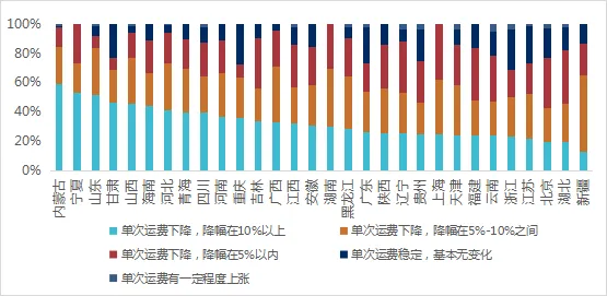 按照各省份对运费收入较去年变化情况来看,多数区域都有超过80%的客户认为本年平均每次运费收入较去年呈现不同程度的下降趋势;其中,内蒙古、宁夏、山东、甘肃、山西、河北超过40%的客户认为降幅在10%以上,对运费下降感知较为明显;浙江、重庆、广东、江苏、贵州超过25%的客户认为本年运费保持相对稳定或略有增长,对运费下降感知程度较低。