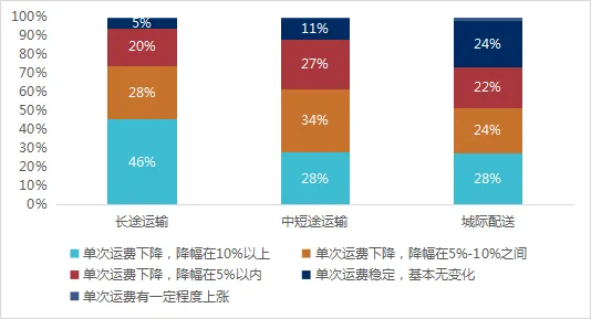 调研数据显示,各运输距离中有超70%客户认为运费收入较去年呈下降趋势;其中,长途运输对运费下降感知较为明显,有超46%的客户认为降幅在10%以上;城际配送整体降幅相对较小,约26%的客户认为基本稳定或小幅上涨。
