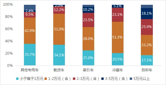调研数据显示,终端营运客户各营运车辆的收入基本都在3万以内,合计占比在75%以上;其中,牵引车、冷藏车及自卸车收入在 2-3万区间居多,在20%以上;载货车运费收入在2万以内累计占比高达85.1%;自卸车整体收入最高,3-5万收入区间占比最高,达18.1%。