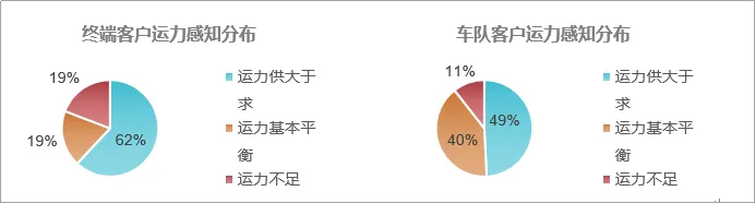 调研数据显示,相较车队,终端营运客户认为运力供大于求即运力过剩的比例更高,达到62%;而车队对运力感知过剩的比例仅为49%。约40%的车队认为当前运力基本保持平衡,而终端客户认为运力基本平衡的比例仅占19%。终端客户认为运力不足的比例也高于车队客户,终端营运客户可能因存在信息不对称,对运力感知逐渐呈分化态势。