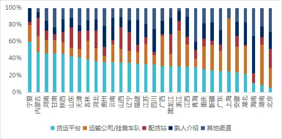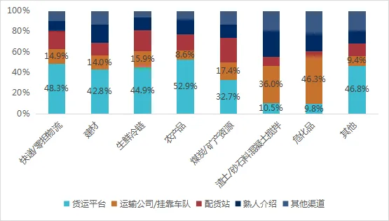 调研数据显示,从客户运输项目的货源结构来看,快递/零担物流、建材、生鲜冷链及农产品货源主要以货运平台为主,占比40%以上;煤炭/矿产资源以货运平台和配货站为主,累计占比56%;渣土/砂石及危化品运输货源主要依靠运输公司/车队。