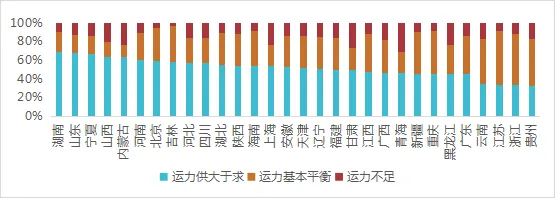 调研将客户对运力的感知情况划分为运力供大于求、运力基本平衡及运力不足三种类型。调研数据显示,从当前各区域对运力整体感知程度来看,超过三分之二的区域认为当前货运市场运力过剩的比例较高,超过50%;其中湖南、山东、山西、内蒙古、河南,认为当前运力过剩的比例超60%,运力过剩感知明显;云南、江苏、浙江、贵州,认为当前运力基本保持平衡的比例相对较高,在50%左右。甘肃、青海对运力不足的感知比例相对较高,在30%以上。
