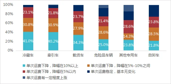调研数据显示,对于各营运车辆运费较去年的变化,均有超过三分之二以上客户认为本年运费较去年出现不同幅度下降;冷藏车、牵引车均有超过40%的客户认为运费较去年降幅在10%以上,30%以上客户认为降幅在5%-10%之间,降幅感知较为明显;自卸车及其他专用车的降幅相对较小。