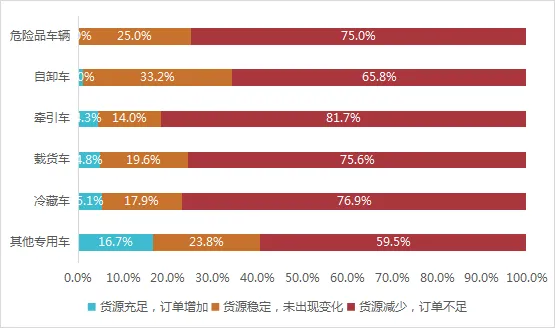调研数据显示,对于各营运车辆的货源变化,认为货源减少、订单不足的情况占绝大部分,除其他专用车外,都有超三分之二以上的比例认为当前货源有所减少,其中牵引车客户对货源减少的感知尤其明显,有超81%的比例认为当前货源有所减少,这与前面所述的牵引车对运费收入下降感知明显一致;其他专用车及自卸车有超30%的客户认为货源稳定或有所增加。