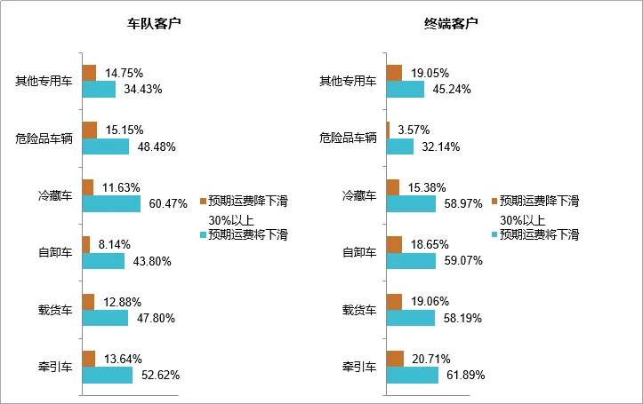 调研数据显示,多数客户对未来半年各营运车辆运费的预期呈下降趋势,对各营运车辆运费预期下降的比例主要集中集中在40%-60%区间。其中,车队客户对冷藏车及危险品车辆运费变化预期更为悲观,预期下降比例分别占60%和48%。终端客户对牵引车、自卸车及其他专用车的运费变化预期更为悲观,预期下降的比例分别为62%、59%及45%。