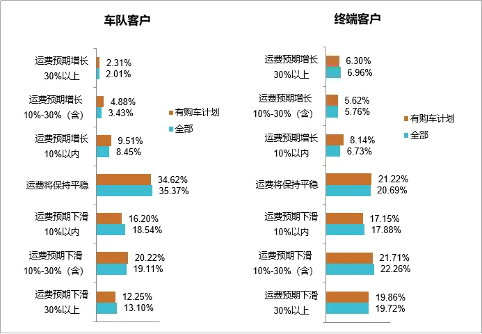 调研数据显示,与对下半年货运市场需求量的预期一致,车队客户和终端客户对下半年货运市场运费的预期均有一半以上持悲观态度;终端客户相比车队客户,对运费的预期更加悲观;车队客户和终端客户对货运市场运费的预期对其购车计划基本没有影响。