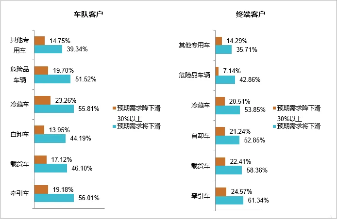 调研数据显示,商用车客户群体对各营运车辆下半年货运量需求持下降预期的比例都比较高,基本在40%-60%区间。其中,车队客户对冷藏车及危险品车辆在下半年的货运量预期更为悲观,预期下降的比例分别为55%和51%。终端客户对牵引车及自卸车在下半年货运量的预期更为悲观,预期下降的比例分别为61%和52%。