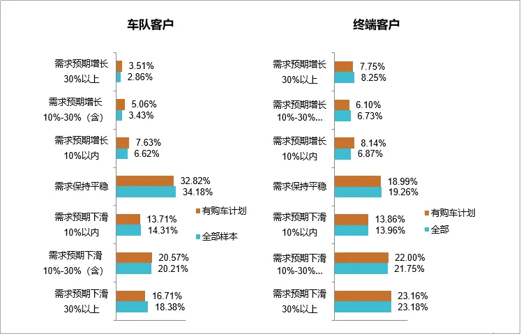 调研数据显示,商用车客户对下半年货运市场需求量多数持悲观态度,车队客户和终端客户对下半年货运市场需求量的预期均有一半以上持悲观态度,而终端客户相比车队客户,对未来货运量的需求预期更加悲观;但是经对比分析,车队客户和终端客户对货运市场需求量的预期对其购车计划基本没有影响,可见客户购车意愿与其对市场的预期并无较强的相关性。