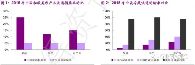 1) 生鲜运输: 我国每年消费的易腐食品超过 10 亿吨,其中需要冷链运输的超过 50%,但目前综合冷链流通率仅为 19%,而欧美的冷链流通率可以达到 95%以上。因此农产品的腐损率相对较高,仅果蔬一类每年的损失额就可以达到1000亿元以上。同时近年来,电商已经延伸至生鲜领域,在平均 3~4天的运送耗时下,冷链物流成为必然趋势。