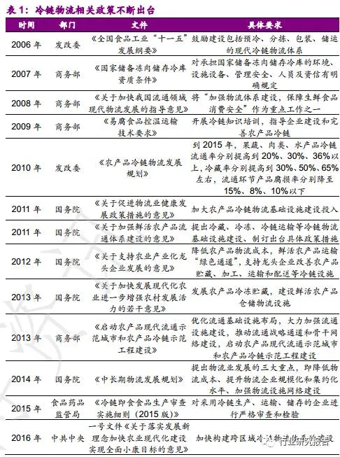 政府层面对于冷链物流的发展高度重视,近年来支持力度不断加大,在多个文件中提出了健全农产品冷链物流体系,支持冷链物流基础设施建设等要求,督导冷链物流行业的快速完善。