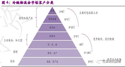从冷链物流的客户来看,可以按金字塔型分为七层。塔顶客户为高附加值的医药、餐饮连锁、快消品类,冷链物流多数采用外包的形式;中间为工业制品和加工型乳制品、速冻米面食品类,也是冷链物流竞争最激烈的市场;然后是食材型禽肉和水产类,最底层为果蔬、农产品类,主要的运送形式依靠社会车辆。