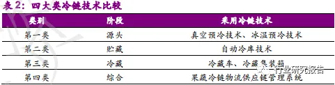 成熟冷链物流涵盖从生产到销售全过程,而整个流程是对生产、加工、储存、销售等过程都进行冷链处理,具体来看可以划分为为四个不同的技术阶段:一是源头采用真空预冷技术和冰温预冷技术;二是在贮藏阶段采用自动冷库技术;三是冷藏运输采用冷藏车、铁路冷藏车和冷藏集装箱配套使用的物流模式;四是运用信息技术建立电子虚拟果蔬冷链物流供应链管理系统,对农产品冷链全过程进行动态监控。