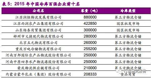 我国冷库大多建于上世纪90年代,主要以氨为制冷剂,但由于氨毒性大容易引起大爆炸,因此现在以二氧化碳制冷系统为主导的冷库成为发展主流。2015年我国冷库的总容量超过3000万吨,容量排在前十位的企业中以第三方物流仓储为主。