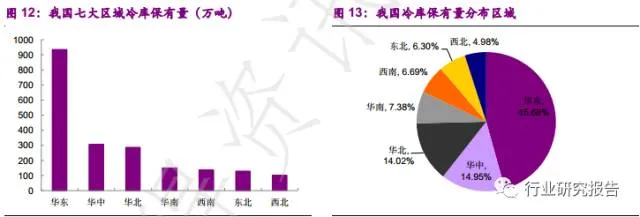 根据中冷联盟的数据统计,国内华东区域的冷库保有量最大,合计达900万吨,占比超过45%。我国冷库的整体建设发展失衡,主要分布在北京、上海等一线城市,而西北片区等内陆城市的分布相对较少。