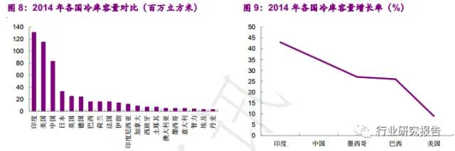 我国目前的冷库总容量超过8000多万立方米,可存储超3000万吨的商品,但很多冷库仅限于肉类、鱼类的冷冻和贮藏,功能相对单一。全球有13个国家冷库容量已经呈现出每年超过10%的增速,其中增长率最高的是土耳其、印度、秘鲁和中国。 2014年,印度冷库容量已经超过美国,成为全球拥有最大冷库容量的国家,其冷库容量达到1.31亿立方米,其中5%由印度政府持有。美国拥有1.15亿立方米冷库容量,其中76%的容量作为公共冷库租赁。根据国际冷藏库协会( IARW)公布的数据显示,全球最大的冷库产业排名前三位的分别是印度、美国和中国。