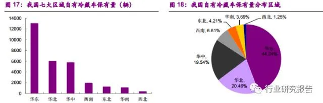 冷藏车的保有量中大约有3万辆自有冷藏车,5万多辆社会冷藏车。冷藏车在国内区域保有量分布中呈现出与冷库类似的格局,华东等地区自有冷藏车密度普遍较高,这些地区普遍经济也比较发达,居民生活水平、消费水平偏高,对食品质量和安全也更为重视。