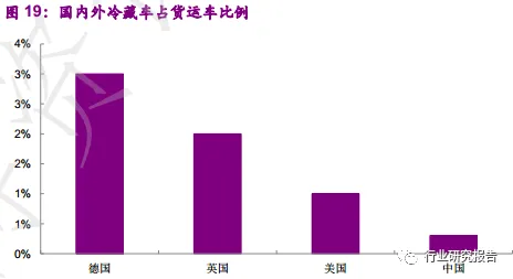 尽管国内冷藏车销量近几年来出现了较快增长,但从冷藏车占货运车的比例来看,和国外相比仍有较大差距。德国占比达到3%,英国2%,美国1%,而中国仅为0.3%。