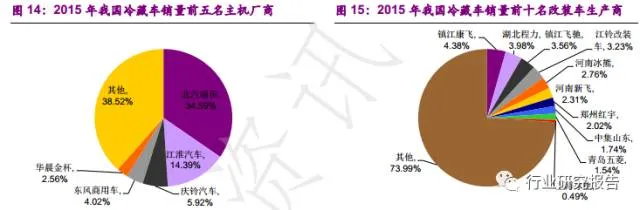 而在改装车生产企业中,我国冷藏车主要分为三大梯队。第一梯队由河南冰熊、中集集团、河南新飞及河南红宇四家企业。第二梯队包括北京晨光、北京北铃、镇江飞驰、河南松川和镇江康飞组成。 第三梯队主要是特种车改装厂和小型企业组成。目前, 中国共有大小近100家企业生产冷藏车,国内重点企业不足10家,以小型企业居多,整个行业参与企业的资质参差不齐。2015年我国冷藏车销量前十名的改装车生产企业销量占全国总销量的26.01%,呈现出行业分散的特点。