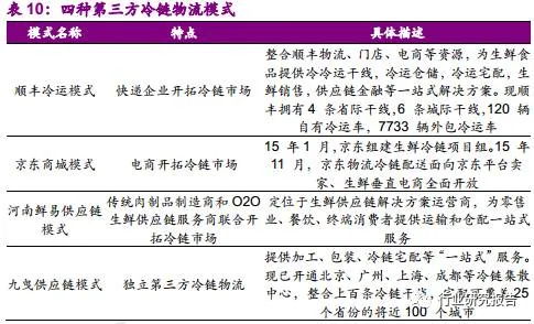 毫无疑问,生鲜电商带动了冷链物流产业的发展,但若由单个生鲜电商厂商独立承担物流,鲜有具备行业整合能力完成从预冷到销售全覆盖的厂商,且运输经营分散难以形成规模效应,因此看好第三方物流对冷链物流行业整合渗透。目前国内已形成包括顺丰冷运模式、京东商城模式、河南鲜易供应链模式和九曳供应链模式在内的四种第三方冷链物流模式。