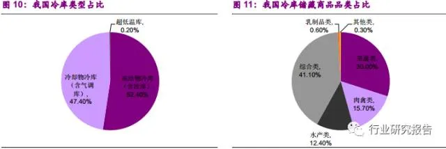 我国冷库种类主要为冻结物冷库、冷却物冷库和超低温库,其中前两者占比较高,超低温库占比仅为0.2%。而从冷库储藏的商品品类来看,以果蔬、肉禽和水产为主的农产品占比较高,合计占比接近 60%。