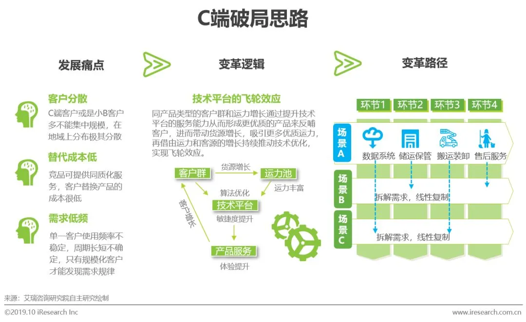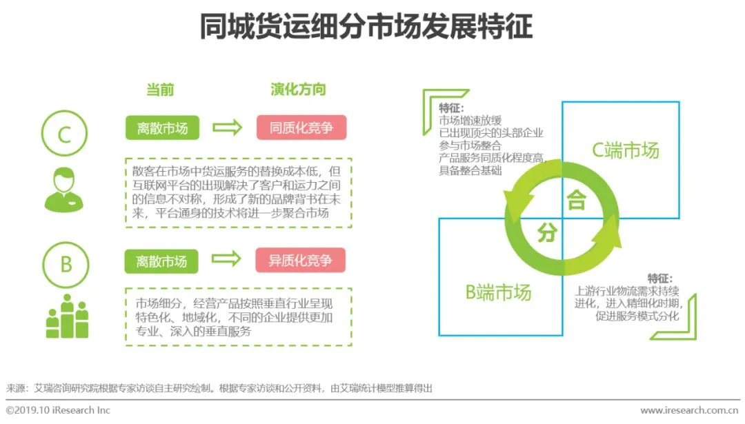 互联网技术带来了C端货运市场的革新,企业通过大数据和技术平台为市场输出了稳定的产品模式,形成品牌背书,虽然散客市场有限,但头部企业仍能通过数字规模效应实现市场整合,形成模式稳定的同质化竞争局面;B端业务中,服务上游行业度复杂,需求差异大,很难应用某一种或几种服务方案拿下市场,随着需求演变和服务体验升级,未来将朝着异质化竞争的市场发展。