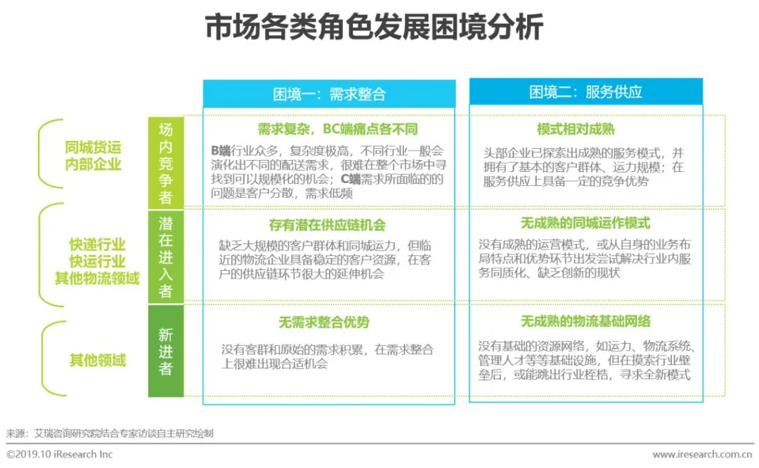 同城货运的上游需求非常的多元复杂且市场分散,需求特征为行业参与者带来了挑战和机会;服务模式上处于不同阶段的企业有着不同的处境和挑战,头部玩家经历多年的原始积累已演化成成熟可行的模式,待入玩家所面临既是进入壁垒,也是创新机会。