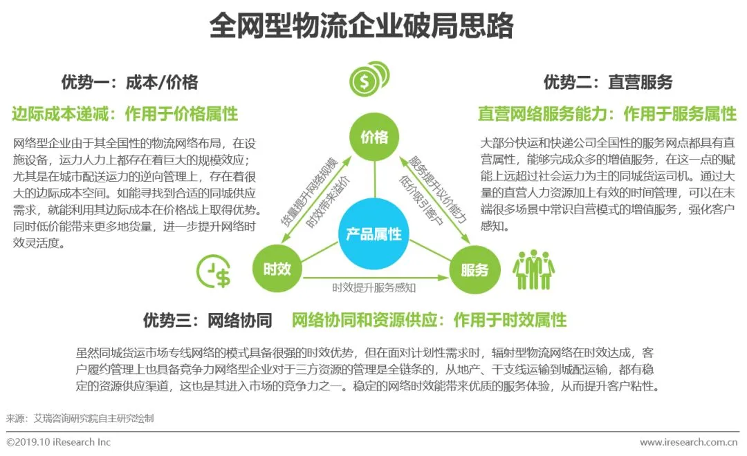 全网快递、快运公司具备强大的物流网络,在干支线运输过程中具有明显的成本优势,但想在城市网络中发挥自己的作战优势,还需要综合货运场景的需求来制定策略,全网企业在产品服务上的优势包括价格(逆向城配边际成本的递减),直营服务(自有网络的增值服务能力)以及网络协同(供应链资源的协同能力)。同时三组产品属性在实际运营过程中能做到相辅相成,有效互补。