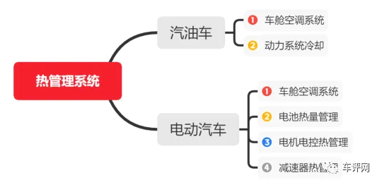 新能源汽车的动力来源和汽油车不同,对应的热管理系统也有极大差异。汽油车热管理系统=空调+动力系统冷却;电动汽车的热管理=空调+电池热管理+电机电控热管理+减速器热管理。