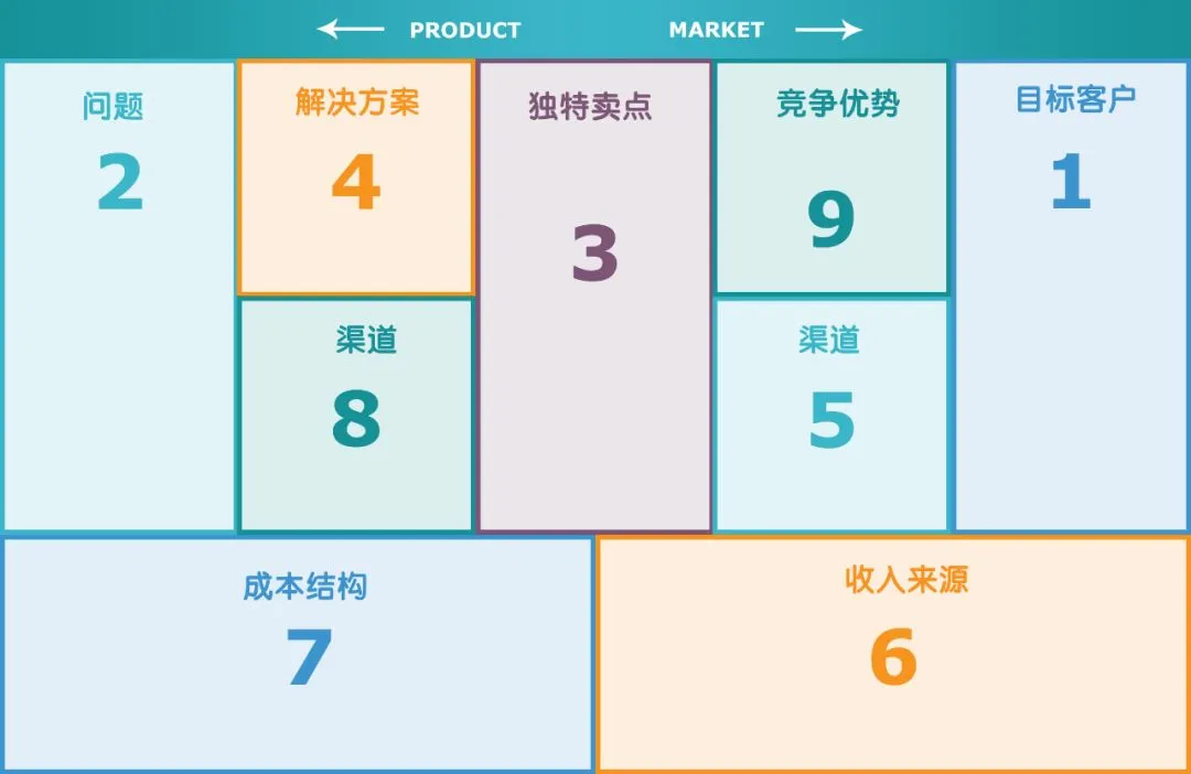 (1)问题;(2)客户群体细分;(3)独特的价值主张;(4)解决方案;(5)渠道;(6)收入分析;(7)成本分析;(8)关键指标;(9)门槛优势。我们制作画布的时候,最好也按照上面这个顺序进行填写。