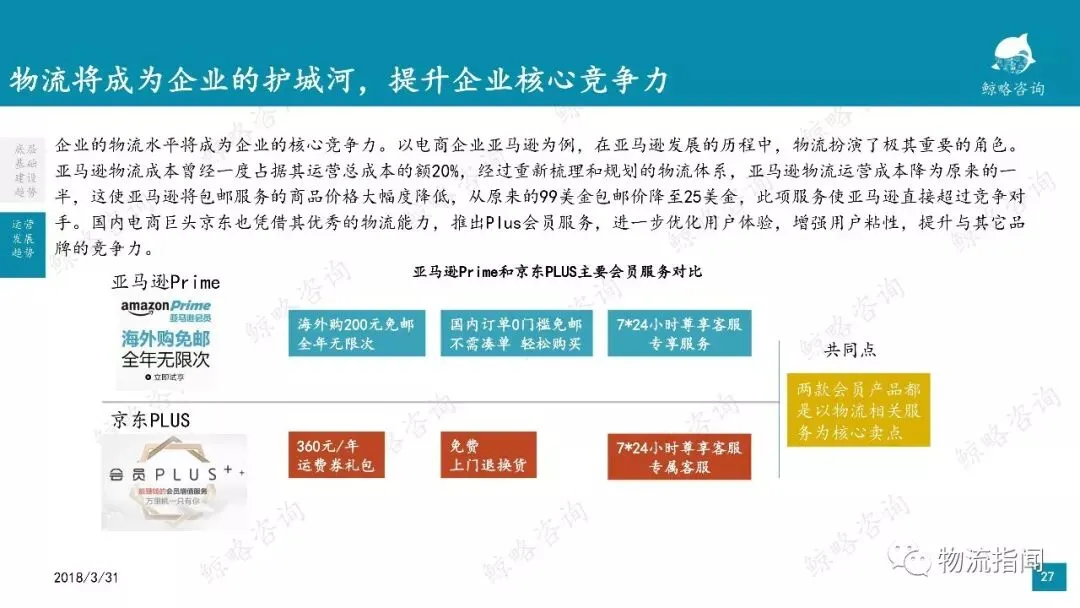 亚马逊物流成本曾经一度占据其运营总成本的额20%,经过重新梳理和规划的物流体系,亚马逊物流运营成本降为原来的一半,这使亚马逊将包邮服务的商品价格大幅度降低,从原来的99美金包邮价降至25美金,此项服务使亚马逊直接超过竞争对手。国内电商巨头京东也凭借其优秀的物流能力,推出Plus会员服务,进一步优化用户体验,增强用户粘性,提升与其它品牌的竞争力。
