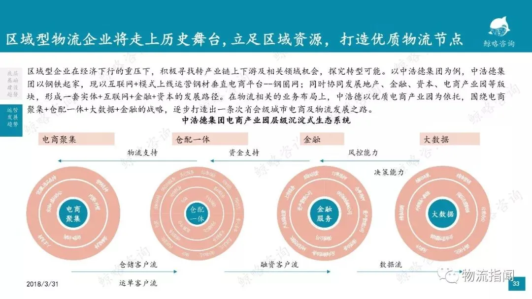 区域型企业在经济下行的重压下,积极寻找转产业链上下游及相关领域机会,探究转型可能。以中浩德集团为例,中浩德集团以钢铁起家,互联网+模式运营线上钢材电商平台--钢圈网。涉足房地产、金融领域、电商产业园,形成一套实体+互联网+金融+资本的发展路径。并以优质电商产业园为依托,围绕电商聚集+仓配一体+大数据+金融的次省会级城市电商及物流发展之路。