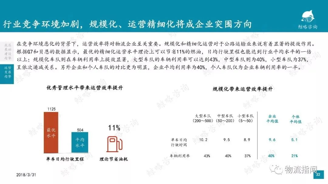 在竞争环境恶化的背景下,运营效率将对物流企业至关重要。规模化和精细化运营对于公路运输业来说有着显著的提效作用。根据G7和贝恩的数据显示,最优的精细化运营水平理论上可以节省11%的燃油,日均行驶里程也能达到行业平均水平的一倍以上;规模化车队则在车辆利用率上提效显著,大型车队的车辆利用率可以达到43%,中型车队则为40%,小型车队为37%,呈依次递减关系。另外企业和个人车队的对比更为明显,企业平均利用率为40%,个人车队仅为企业车辆利用率的一半。