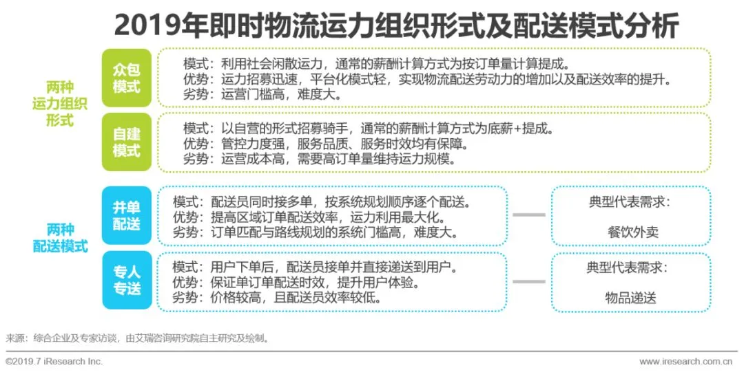 在即时物流的发展过程中,不同的需求类型会催生不同的存在形式,例如众包和自建两种运力组织形式,以及并单配送和专人专送两种配送模式。而正是由于多种不同需求类型的存在,才会使得即时物流市场更加多元化且即时物流服务方式更加多样化。