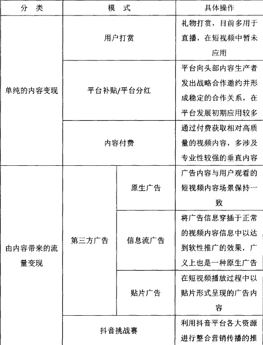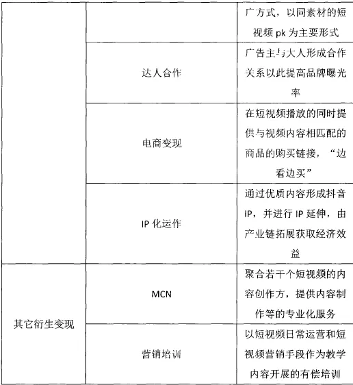 通过对于部分典型抖音账号的内容分析,将目前短视频平台中现行的盈利模式归纳如下: