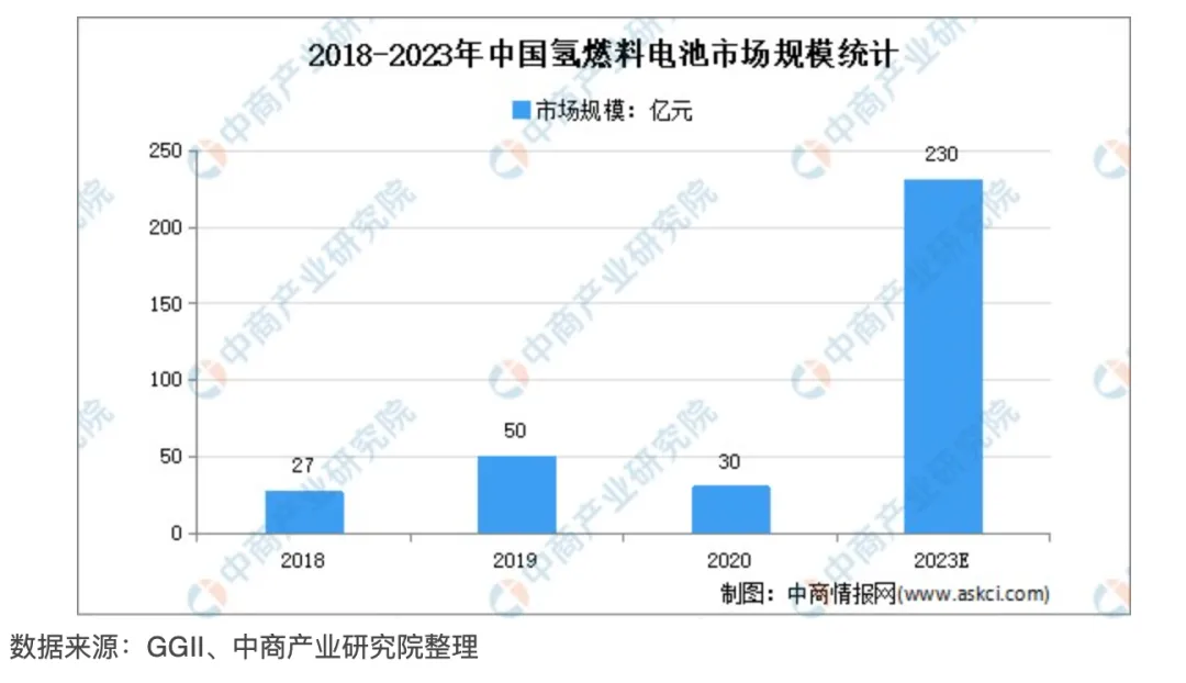 2016年我国的氢燃料电池产业市场规模为3亿元,2019增长至50亿元,因疫情与政策的影响,2020年氢燃料电池产业市场规模缩减至30亿元。随着氢燃料电池系统成本的降低,下游应用增多,预计在2023年中国氢燃料电池产业市场规模将会达到230亿元。